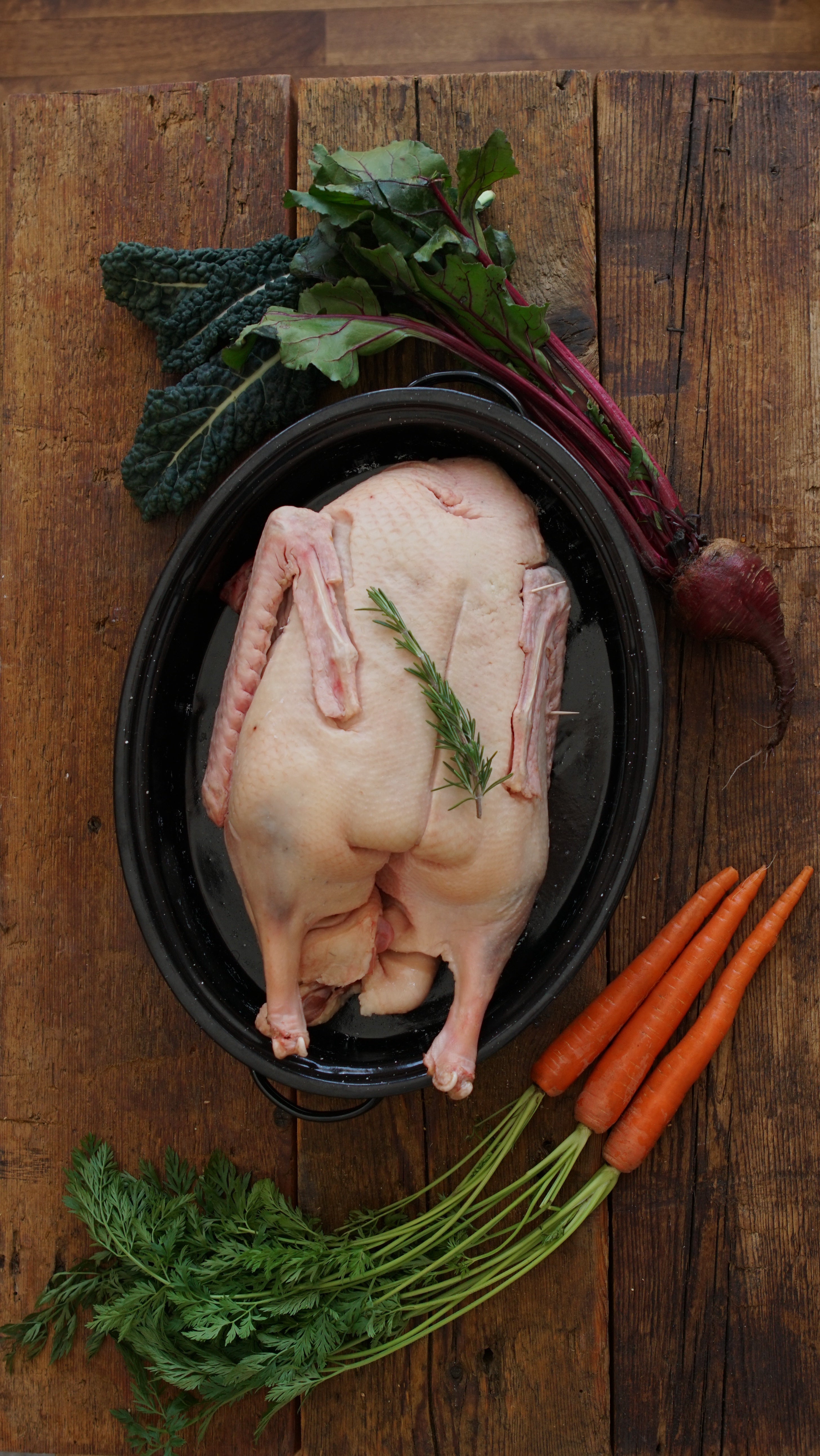 Disponible entière ou en découpe - Nos oies, non gavées, sont élevées en plein air, de manière éthique et en harmonie avec la nature pendant 24 semaines (plutôt que 8 semaines dans un élevage industriel).